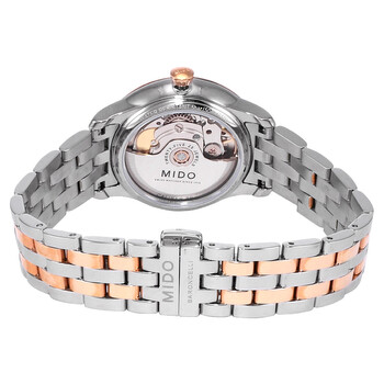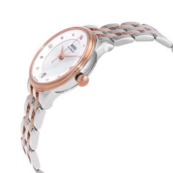 Stainless steel case with a two-tone (silver-tone and rose gold PVD) stainless steel bracelet. Fixed rose gold PVD bezel. White mother of pearl dial with rose gold-tone hands and dot hour markers. Diamonds set astthe 3, 9 and 12 o'clock positions. Dial Type: Analog. Date display at the 6 o'clock position. Mido calibre Powermatic 80 (ETA C07.611) automatic movement, based upon ETA 2824-2, containing 23 Jewels, bitting at 21600 vph, and has a power reserve of approximately 80 hours. Scratch resistant sapphire crystal. Pull / push crown. Transparent case back. Round case shape. Case size: 33 mm. Case thickness: 9.9 mm. Band width: 16 mm. Fold over clasp with a push button release. Water resistant at 50 meters / 165 feet. Functions: date, hour, minute, second. Additional Info: dial set with 3 diamonds 0.0510 cts. Baroncelli Series. Dress watch style. Watch label: Swiss Made. Mido Baroncelli Automatic Diamond White Mother of Pearl Dial Ladies Watch M0392072210600.