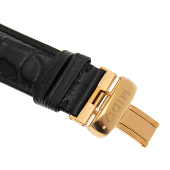 Rose gold-tone stainless steel case with a black leather strap. Fixed rose gold-tone bezel. Black dial with rose gold-tone dauphine-style hands and index hour markers. Minute markers around the outer rim. Dial Type: Analog. Date display at the 3 o'clock position. Power reserve indicator subdials. ETA caliber 2897 automatic movement, based upon ETA 2892, containing 21 Jewels, bitting at 28800 vph, and has a power reserve of approximately 42 hours. Scratch resistant sapphire crystal. Pull / push crown. Transparent case back. Round case shape. Case size: 42 mm. Case thickness: 9.75 mm. Band width: 22 mm. Fold over clasp. Water resistant at 50 meters / 165 feet. Functions: date, hour, minute, second, power reserve indicator. Baroncelli Series. Luxury watch style. Watch label: Swiss Made. Mido Baroncelli Automatic Men's Watch M8605.3.13.4.