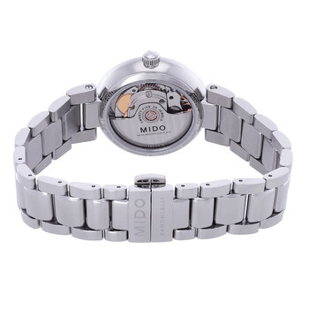 Silver-tone stainless steel case and bracelet. Fixed silver-tone stainless steel bezel. Mother of pearl dial with silver-tone hands and diamond-Roman numeral hour markers. Roman numeral marker appears at the 3, 9 and 12 o'clock positions. Dial Type: Analog. Date display at the 6 o'clock position. Automatic movement. Scratch resistant sapphire crystal. Pull / push crown. Transparent case back. Round case shape, case size: 33 mm. Deployment with push button release clasp. Water resistant at 50 meters / 165 feet. Functions: date, hour, minute, second. Baroncelli Series. Dress watch style. Watch label: Swiss Made. Mido Baroncelli Automatic Mother of Pearl Dial Ladies Watch M0222071111610.
