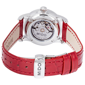 Stainless steel case with a red leather strap. Fixed stainless steel bezel set with diamonds. Mother of pearl dial with silver-tone hands and diamond hour markers. Minute markers around the outer rim. Dial Type: Analog. Date display between the 4 and 5 o'clock positions. Automatic movement. Scratch resistant sapphire crystal. Pull / push crown. Transparent case back. Round case shape. Case size: 29 mm. Case thickness: 8.65 mm. Band width: 15 mm. Deployment clasp. Water resistant at 50 meters / 165 feet. Functions: date, hour, minute, second. Baroncelli Series. Dress watch style. Watch label: Swiss Made. Mido Baroncelli Automatic Mother of Pearl Diamond Dial Ladies Watch M76024697.