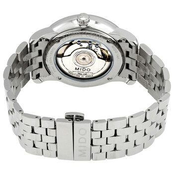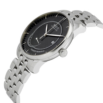 Stainless steel case with a stainless steel bracelet. Fixed stainless steel bezel. Black dial with silver-tone hands and index hour markers. Minute markers around the outer rim. Dial Type: Analog. Date display at the 3 o'clock position. Power reserve display. ETA caliber 2897 automatic movement, based upon ETA 2892, containing 21 Jewels, bitting at 28800 vph, and has a power reserve of approximately 42 hours. Scratch resistant sapphire crystal. Pull / push crown. Transparent case back. Round case shape. Case size: 42 mm. Case thickness: 9.75 mm. Band width: 22 mm. Fold over clasp with a push button release. Water resistant at 50 meters / 165 feet. Functions: date, hour, minute, second, power reserve indicator. Luxury watch style. Watch label: Swiss Made. Mido Baroncelli Automatic Power Reserve Men's Watch M8605.4.13.1.