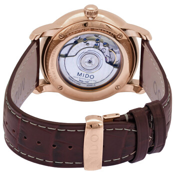 Rose gold PVD stainless steel case with a brown leather strap. Fixed rose gold PVD stainless steel bezel. Silver dial with rose gold-tone hands and index hour markers. Minute markers around the outer rim. Dial Type: Analog. Date display at the 3 o'clock position. One subdial displaying: power reserve indicator. ETA Caliber 2897 Automatic movement, based upon ETA 2892, containing 21 Jewels, bitting at 28800 vph, and has a power reserve of approximately 42 hours. Scratch resistant sapphire crystal. Pull / push crown. Transparent case back. Round case shape, case size: 42 mm, case thickness: 9.75 mm. Band width: 22 mm. Fold over clasp. Water resistant at 50 meters / 165 feet. Functions: date, hour, minute, second, power reserve indicator. Baroncelli Series. Luxury watch style. Watch label: Swiss Made. Mido Baroncelli Automatic Silver Dial Men's Watch M86053118.