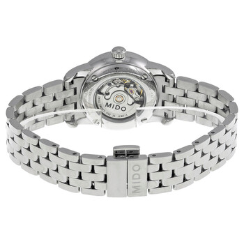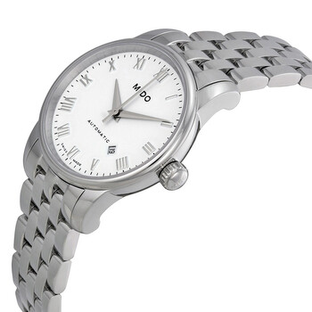 Stainless steel case with a stainless steel bracelet. Fixed stainless steel bezel. White dial with silver-tone hands and Roman numeral hour markers. Minute markers around the outer rim. Dial Type: Analog. Date display between the 4 and 5 o'clock positions. Swiss automatic movement with a 38-hour power reserve. Scratch resistant sapphire crystal. Pull / push crown. Skeleton case back. Case diameter: 29 mm. Case thickness: 8 mm. Round case shape. Band width: 14 mm. Band length: 7 inches. Fold over clasp. Water resistant at 50 meters / 165 feet. Functions: date, hour, minute, second. Dress watch style. Mido Baroncelli Automatic White Dial Stainless Steel Ladies Watch M76004261.