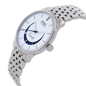 Silver-tone stainless steel case and bracelet. Fixed silver-tone stainless steel bezel. White dial with silver-tone hands and index-Roman numeral hour markers. Roman numeral marker appears at the 12 o'clock position. Dial Type: Analog. Moon disc at 6 o’clock. Automatic movement with a 72-hour power reserve. Scratch resistant sapphire crystal. Transparent case back. Round case shape, case size: 39 mm, case thickness: 7.3 mm. Band width: 20 mm. Folding clasp. Water resistant at 30 meters / 100 feet. Functions: hour, minute, second. Baroncelli Series. Sport watch style. Watch label: Swiss Made. Mido Baroncelli Automatic White Dial Men's Watch M0274071101001.
