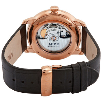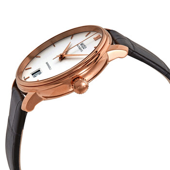 Rose gold PVD stainless steel case with a black leather strap. Fixed rose gold PVD bezel. White dial with rose gold-tone hands and index hour markers. Roman numeral appears at the 12 o'clock position. Dial Type: Analog. Date display above the 6 o'clock position. Mido calibre 80 (base ETA C07.651) automatic movement, containing 25 Jewels, bitting at 21600 vph, and has a power reserve of approximately 80 hours. Scratch resistant sapphire crystal. Pull / push crown. Transparent case back. Round case shape. Case size: 40 mm. Case thickness: 10.38 mm. Band width: 20 mm. Deployment clasp. Water resistant at 30 meters / 100 feet. Functions: big date, hour, minute, second. Baroncelli Series. Dress watch style. Watch label: Swiss Made. Mido Baroncelli Automatic White Dial Men's Watch M0274263601800.