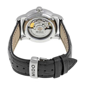 Stainless steel case with a black leather strap. Fixed stainless steel bezel. White dial with silver-tone dauphine-style hands and Roman numeral hour markers. Minute markers around the outer rim. Dial Type: Analog. Date display between 4 and 5 o'clock position. ETA caliber 2824-2 automatic movement, based upon ETA 2824, containing 25 Jewels, bitting at 28800 vph, and has a power reserve of approximately 38 hours. Scratch resistant sapphire crystal. Pull / push crown. Skeleton case back. Round case shape. Case size: 38 mm. Case thickness: 10 mm. Band width: 18 mm. Deployment clasp. Water resistant at 50 meters / 165 feet. Functions: date, hour, minute, second. Casual watch style. Watch label: Swiss Made. Item Variations: M8600 4 21 4, M8600-4-21-4, M8600/4/21/4, M86004214. Mido Baroncelli Automatic White Dial Men's Watch M86004214.