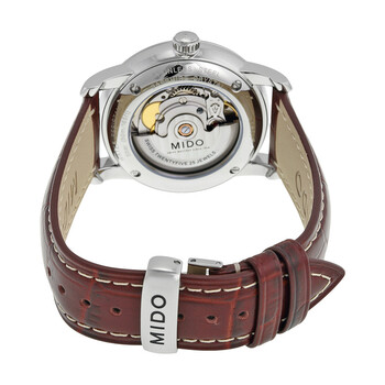 Stainless steel case with a brown leather strap. Fixed stainless steel bezel. White dial with silver-tone dauphine-style hands and Roman numeral hour markers. Minute markers around the outer rim. Dial Type: Analog. Date display between the 4 and 5 o'clock positions. ETA caliber 2824-2 automatic movement, based upon ETA 2824, containing 25 Jewels, bitting at 28800 vph, and has a power reserve of approximately 38 hours. Scratch resistant mineral crystal. Pull / push crown. Skeleton case back. Round case shape. Case size: 38 mm. Case thickness: 9.1 mm. Band width: 20 mm. Fold over clasp with a push button release. Water resistant at 50 meters / 165 feet. Functions: date, hour, minute, second. Casual watch style. Watch label: Swiss Made. Item Variations: M8600 4 26 8, M8600-4-26-8, M8600/4/26/8, M86004268. Mido Baroncelli Automatic White Dial Men's Watch M86004268.