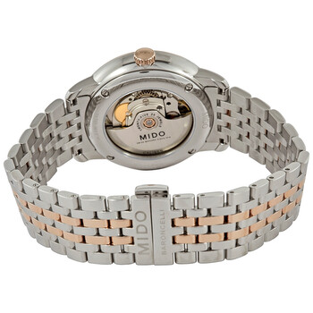Stainless steel case with a two-tone (silver and rose gold PVD) stainless steel bracelet. Fixed rose gold PVD bezel. Anthracite dial with rose gold-tone dauphine-style hands and index hour markers. A Roman numeral appears at the 12 o'clock position. Dial Type: Analog. Date display at the 6 o'clock position. Mido calibre 80 (base ETA C07.651) automatic movement, containing 25 Jewels, bitting at 21600 vph, and has a power reserve of approximately 80 hours. Scratch resistant sapphire crystal. Pull / push crown. Transparent case back. Round case shape. Case size: 40 mm. Case thickness: 10.38 mm. Band width: 20 mm. Butterfly clasp. Water resistant at 30 meters / 100 feet. Functions: big date, hour, minute, second. Baroncelli Big Date Series. Casual watch style. Watch label: Swiss Made. Mido Baroncelli Big Date Automatic Men's Watch M027.426.22.088.00.