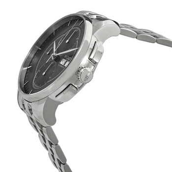 Stainless steel case with a stainless steel bracelet. Fixed stainless steel bezel. Black dial with silver-tone hands and index hour markers. Minute markers around the outer rim. Dial Type: Analog. Day of the week and date display at the 3 o'clock position. Chronograph - three sub-dials displaying: small second, 30 minute and 12 hour. Automatic movement. Scratch resistant sapphire crystal. Transparent case back. Round case shape. Case size: 42 mm. Case thickness: 13.3 mm. Band width: 22 mm. Fold over clasp with a push button release. Water resistant at 50 meters / 165 feet. Functions: chronograph, day, date, hour, minute, second. Baroncelli Series. Dress watch style. Watch label: Swiss Made. Mido Baroncelli Chronograph Automatic Black Dial Men's Watch M86074131.