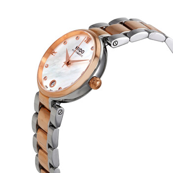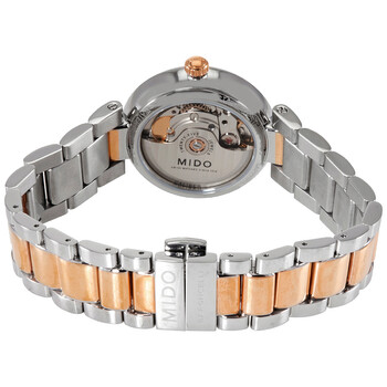 Stainless steel case with a two-tone (silver-tone and rose gold-tone) leather strap. Fixed rose gold-tone bezel. Beige dial with rose gold-tone hands and diamond hour markers. Roman numerals appear at the 3, 9 and 12 o'clock positions. Dial Type: Analog. Date display at the 6 o'clock position. Automatic movement. Scratch resistant sapphire crystal. Pull / push crown. Transparent case back. Round case shape. Case size: 33 mm. Case thickness: 10.6 mm. Fold over clasp with a safety release. Water resistant at 50 meters / 165 feet. Functions: date, hour, minute, second. Additional Info: 8 precious stones; 0.0400 carat; clarity: vs-si. Baroncelli Donna Series. Dress watch style. Watch label: Swiss Made. Mido Baroncelli Donna Automatic Diamond Ladies Watch M022.207.22.116.10.