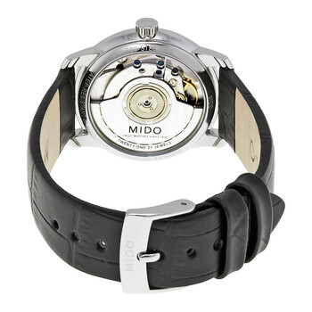 Stainless steel case with a black leather strap. Fixed stainless steel bezel. White dial with silver-tone hands and index hour markers. Minute markers around the outer rim. Dial Type: Analog. Date display at the 3 o'clock position. Mido calibre 1192 automatic movement, based upon ETA 2892-A2, containing 21 Jewels, bitting at 28800 vph, and has a power reserve of approximately 42 hours. Scratch resistant sapphire crystal. Pull / push crown. Transparent case back. Round case shape. Case size: 33 mm. Case thickness: 6.85 mm. Band width: 17 mm. Fold over clasp. Water resistant at 30 meters / 100 feet. Functions: date, hour, minute, second. Baroncelli Heritage Series. Casual watch style. Watch label: Swiss Made. Mido Baroncelli Heritage Automatic Ladies Watch M027.207.16.010.00.