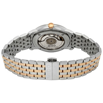 Stainless steel case with a two-tone (silver-tone and rose gold PVD) stainless steel bracelet. Fixed rose gold PVD bezel. White dial with rose gold-tone hands and index hour markers. Minute markers around the outer rim. Dial Type: Analog. Date display at the 3 o'clock position. MIDO 1192 automatic movement with a 42-hour power reserve. Scratch resistant sapphire crystal. Pull / push crown. Transparent case back. Round case shape. Case size: 39 mm. Case thickness: 6.95 mm. Band width: 20 mm. Fold over clasp with a push button release. Water resistant at 30 meters / 100 feet. Functions: date, hour, minute, second. Casual watch style. Watch label: Swiss Made. Mido Baroncelli Heritage Automatic White Dial Men's Watch M027.407.22.010.00.