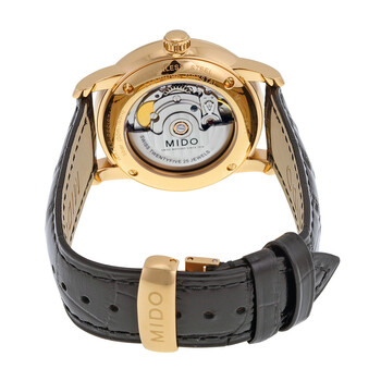 Rose gold PVD stainless steel case with a black leather strap. Fixed rose gold PVD stainless steel bezel. Black dial with rose gold-tone dauphine-style shape hands and index hour markers. Minute markers around the outer rim. Dial Type: Analog. Date display between 4 and 5 o'clock position. ETA Caliber 2824-2 Automatic movement, based upon ETA 2824, containing 25 Jewels, bitting at 28800 vph, and has a power reserve of approximately 38 hours. Scratch resistant sapphire crystal. Pull / push crown. Transparent case back. Round case shape, case size: 38 mm, case thickness: 9 mm. Band width: 18 mm. Deployment clasp. Water resistant at 50 meters / 165 feet. Functions: date, hour, minute, second. Casual watch style. Watch label: Swiss Made. Mido Baroncelli II Automatic Black Dial Men's Watch M86003134.
