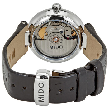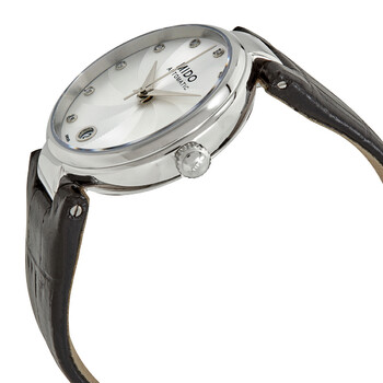 Stainless steel case with a black leather strap. Fixed stainless steel bezel. Silver dial with silver-tone dauphine-style hands and diamond hour markers. Dial Type: Analog. Date display at the 6 o'clock position. Mido Calibre 80 automatic movement with an 80-hour power reserve. Scratch resistant sapphire crystal. Pull / push crown. Round case shape. Case size: 33 mm. Case thickness: 10 mm. Fold over clasp with a push button release. Water resistant at 50 meters / 165 feet. Functions: date, hour, minute, second. Baroncelli II Series. Dress watch style. Watch label: Swiss Made. Mido Baroncelli II Automatic Diamond Silver Dial Ladies Watch M0222071603610.