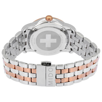 Stainless steel case with a two-tone (silver-tone and rose gold-tone) stainless steel bracelet. Fixed rose gold-tone stainless steel bezel. Ivory dial with rose gold-tone hands and index hour markers. Minute markers around the outer rim. Dial Type: Analog. Date display between 4 and 5 o'clock position. Automatic movement. Scratch resistant sapphire crystal. Pull / push crown. Transparent case back. Round case shape, case size: 38 mm, case thickness: 9.1 mm. Band width: 20 mm. Deployment with push button release clasp. Water resistant at 50 meters / 165 feet. Functions: date, hour, minute, second. Baroncelli II Series. Luxury watch style. Watch label: Swiss Made. Mido Baroncelli II Automatic Ivory Dial Men's Watch M86009S71.