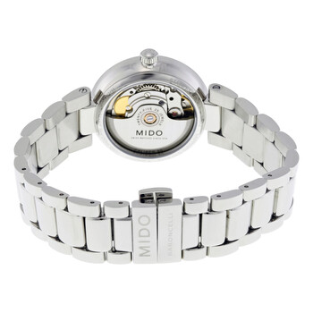 Stainless steel case with a stainless steel bracelet. Fixed stainless steel bezel. Silver dial with rose gold-tone hands and diamond hour markers. Dial Type: Analog. Date display at the 6 o'clock position. Mido caliber 80.611 automatic movement with a 80-hour power reserve. Scratch resistant sapphire crystal. Transparent case back. Case size: 33 mm. Case thickness: 10.5 mm. Round case shape. Fold over clasp. Water resistant at 50 meters / 165 feet. Functions: date, hour, minute, second. Dress watch style. Watch label: Swiss Made. Mido Baroncelli II Automatic Ladies Watch M022.207.11.036.10.