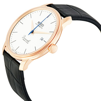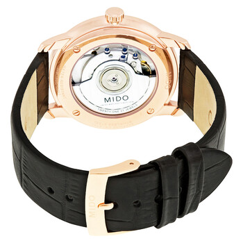 Rose gold PVD stainless steel case with a black leather strap. Fixed rose gold PVD bezel. Ivory dial with rose gold-tone dauphine-style hands and index hour markers. Minute markers around the outer rim. Dial Type: Analog. Date display at the 3 o'clock position. ETA caliber 2892-A2 automatic movement, based upon ETA 2890, containing 21 Jewels, bitting at 28800 vph, and has a power reserve of approximately 42 hours. Scratch resistant sapphire crystal. Pull / push crown. Transparent case back. Round case shape. Case size: 33 mm. Case thickness: 8.85 mm. Band width: 17 mm. Tang clasp. Water resistant at 30 meters / 100 feet. Functions: date, hour, minute, second. Luxury watch style. Watch label: Swiss Made. Mido Baroncelli II Automatic Ladies Watch M027.207.36.260.00.