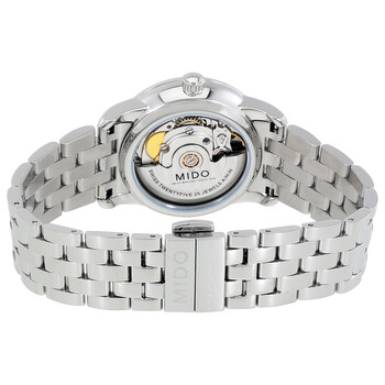 Stainless steel case with a stainless steel bracelet. Fixed stainless steel bezel. Silver dial with silver-tone dauphine-style hands and Roman numeral hour markers. Minute markers around the outer rim. Dial Type: Analog. Date display at the 6 o'clock position. ETA caliber C07.611 automatic movement, containing 25 Jewels, bitting at 21600 vph, and has a power reserve of approximately 80 hours. Scratch resistant sapphire crystal. Screw down crown. Skeleton case back. Round case shape. Case size: 33 mm. Case thickness: 9.4 mm. Band width: 20 mm. Fold over clasp. Water resistant at 50 meters / 165 feet. Functions: date, hour, minute, second. Baroncelli II Series. Casual watch style. Watch label: Swiss Made. Mido Baroncelli II Automatic Silver Dial Ladies Watch M0072071103800.