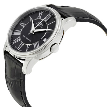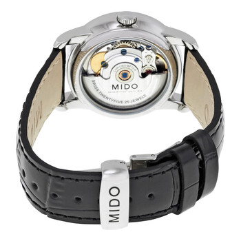Stainless steel case with a black (crocodile) leather strap. Fixed stainless steel bezel. Black dial with silver-tone hands and Roman numeral hour markers. Minute markers around the outer rim. Dial Type: Analog. Date display at the 3 o'clock position. Mido calibre ETA 2836-2 automatic movement with a 40-hour power reserve. Scratch resistant sapphire crystal. Push / pull crown. Transparent case back. Case size: 33 mm. Case thickness: 10.5 mm. Round case shape. Band width: 18 mm. Tang clasp. Water resistant at 50 meters / 165 feet. Functions: date, hour, minute, second. Dress watch style. Watch label: Swiss Made. Mido Baroncelli III Automatic Black Dial Ladies Watch M0102081605320.
