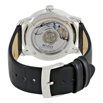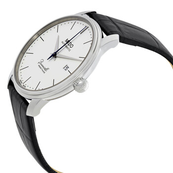 Stainless steel case with a black leather strap. Fixed stainless steel bezel. White dial with silver-tone dauphine-style hands and index hour markers. Minute markers around the outer rim. Dial Type: Analog. Date display at the 3 o'clock position. ETA caliber 2892-A2 automatic movement, based upon ETA 2890, containing 21 Jewels, bitting at 28800 vph, and has a power reserve of approximately 42 hours. Scratch resistant sapphire crystal. Pull / push crown. Transparent case back. Round case shape. Case size: 39 mm. Case thickness: 6.95 mm. Band width: 20 mm. Tang clasp. Water resistant at 30 meters / 100 feet. Functions: date, hour, minute, second. Dress watch style. Watch label: Swiss Made. Mido Baroncelli III Automatic Men's Watch M027.407.16.010.00.