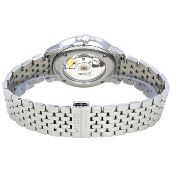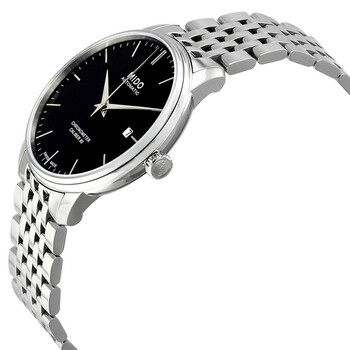 Silver-tone stainless steel case with a silver-tone stainless steel bracelet. Fixed silver-tone stainless steel bezel. Black dial with silver-tone hands and index hour markers. Minute markers around the outer rim. Dial Type: Analog. Luminescent hands and markers. Date display at the 3 o'clock position. Mido Calibre Powermatic 80 COSC (base ETA C07.621 Automatic movement, based upon ETA C07.621, containing 25 Jewels, bitting at 21600 vph, and has a power reserve of approximately 80 hours. Scratch resistant sapphire crystal. Pull / push crown. Transparent case back. Round case shape, case size: 40 mm, case thickness: 9 mm. Band width: 20 mm. Fold over clasp. Water resistant at 30 meters / 100 feet. Functions: date, hour, minute, second, chronometer. Baroncelli IIi Series. Casual watch style. Watch label: Swiss Made. Mido Baroncelli III Automatic Men's Watch M027.408.11.051.00.