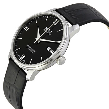 Silver-tone stainless steel case with a black leather strap. Fixed silver-tone stainless steel bezel. Black dial with black hands and index hour markers. Roman numerals mark the 3, 6, 9 and 12 o'clock positions. minute markers around the outer rim. Dial Type: Analog. Date display at the 3 o'clock position. Mido Calibre Powermatic 80 COSC (base ETA C07.621 Automatic movement, based upon ETA C07.621, containing 25 Jewels, bitting at 21600 vph, and has a power reserve of approximately 80 hours. Scratch resistant sapphire crystal. Pull / push crown. Transparent case back. Round case shape, case size: 40 mm, case thickness: 9.43 mm. Band width: 20 mm. Fold over clasp. Water resistant at 30 meters / 100 feet. Functions: date, hour, minute, second, chronometer. Baroncelli IIi Series. Casual watch style. Watch label: Swiss Made. Mido Baroncelli III Automatic Men's Watch M027.408.16.058.00.