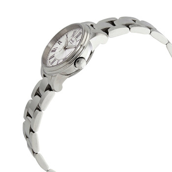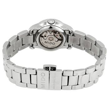 Stainless steel case with a stainless steel bracelet. Fixed stainless steel bezel. Silver dial with silver-tone hands and Roman numeral hour markers. Minute markers around the outer rim. Dial Type: Analog. Date display at the 3 o'clock position. Automatic movement. Scratch resistant sapphire crystal. Pull / push crown. Transparent case back. Round case shape. Case size: 25 mm. Band width: 13 mm. Fold over clasp. Water resistant at 50 meters / 165 feet. Functions: date, hour, minute, second. Baroncelli IIi Series. Dress watch style. Watch label: Swiss Made. Mido Baroncelli III Automatic Silver Dial Ladies Watch M0100071103309.