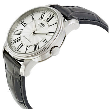 Stainless steel case with a black crocodile leather strap. Fixed stainless steel bezel. Silver dial with silver-tone hands and Roman numeral hour markers. Minute markers around the outer rim. Dial Type: Analog. Date display at the 3 o'clock position. Mido calibre ETA 2836-2 automatic movement with a 40-hour power reserve. Scratch resistant sapphire crystal. Transparent case back. Case size: 33 mm. Case thickness: 10.5 mm. Round case shape. Band width: 18 mm. Tang clasp. Water resistant at 50 meters / 165 feet. Functions: date, hour, minute, second. Dress watch style. Watch label: Swiss Made. Mido Baroncelli III Automatic Silver Dial Ladies Watch M0102081603320.