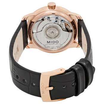Rose gold PVD stainless steel case with a black leather strap. Fixed rose gold PVD bezel. Silver dial with rose gold-tone dauphine-style hands and Roman numeral hour markers. Dial Type: Analog. Date display at the 3 o'clock position. ETA caliber 2892-A2 automatic movement, based upon ETA 2890, containing 21 Jewels, bitting at 28800 vph, and has a power reserve of approximately 42 hours. Scratch resistant sapphire crystal. Pull / push crown. Transparent case back. Round case shape. Case size: 33 mm. Case thickness: 6.85 mm. Band width: 17 mm. Fold over clasp with a push button release. Water resistant at 30 meters / 100 feet. Functions: date, hour, minute, second. Casual watch style. Watch label: Swiss Made. Mido Baroncelli III Automatic Silver Dial Ladies Watch M0272073601300.
