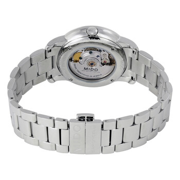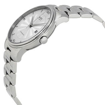 Stainless steel case with a stainless steel bracelet. Fixed stainless steel bezel. Silver dial with silver-tone hands and index hour markers. Arabic numerals mark the 3, 6, 9 and 12 o'clock positions. Minute markers around the outer rim. Dial Type: Analog. Date display at the 3 o'clock position. Mido calibre ETA 2836-2 automatic movement with a 40-hour of power reserve. Scratch resistant sapphire crystal. Transparent case back. Case size: 39 mm. Case thickness: 10.45 mm. Round case shape. Band width: 17 mm. Deployment clasp with a push button release. Water resistant at 50 meters / 165 feet. Functions: date, hour, minute, second. Dress watch style. Watch label: Swiss Made. Mido Baroncelli III Automatic Silver Dial Men's Watch M0104081103700.