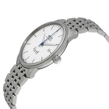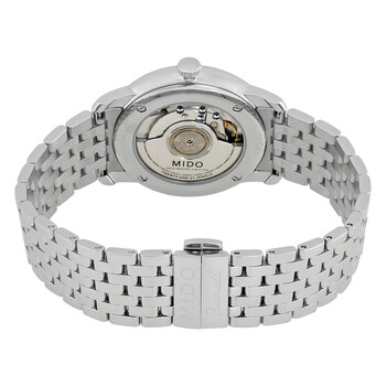 Stainless steel case with a stainless steel bracelet. Fixed stainless steel bezel. White dial with silver-tone dauphine-style hands and index hour markers. Minute markers around the outer rim. Dial Type: Analog. Date display at the 3 o'clock position. Mido calibre 1192 automatic movement, based upon ETA 2892-A2, containing 21 Jewels, bitting at 28800 vph, and has a power reserve of approximately 42 hours. Scratch resistant sapphire crystal. Pull / push crown. Transparent case back. Round case shape. Case size: 39 mm. Case thickness: 6.95 mm. Band width: 20 mm. Fold over clasp with a push button release. Water resistant at 30 meters / 100 feet. Functions: date, hour, minute, second. Baroncelli IIi Series. Casual watch style. Watch label: Swiss Made. Mido Baroncelli III Automatic White Dial Men's Watch M0274071101000.