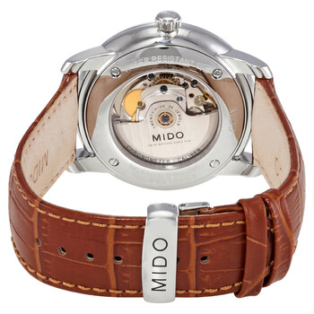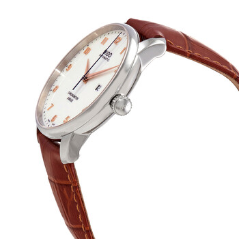 Stainless steel case with a brown leather strap. Fixed stainless steel bezel. Ivory dial with rose gold-tone hands and Arabic numeral hour markers. Minute markers around the outer rim. Dial Type: Analog. Date display at the 3 o'clock position. Mido caliber 80 COSC Si (base ETA C07.821) automatic movement, containing 25 Jewels, bitting at 21600 vph, and has a power reserve of approximately 80 hours. Scratch resistant sapphire crystal. Pull / push crown. Transparent case back. Round case shape. Case size: 42 mm. Case thickness: 9.8 mm. Band width: 22 mm. Fold over clasp with a push button release. Water resistant at 50 meters / 165 feet. Functions: date, hour, minute, second, chronometer. Baroncelli Jubilee Series. Dress watch style. Watch label: Swiss Made. Mido Baroncelli Jubilee Automatic Chronometer Ivory Dial Men's Watch M0376081626200.