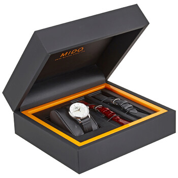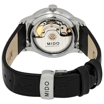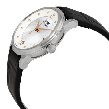 Stainless steel case with a black leather strap. Fixed stainless steel bezel. White mother of pearl dial with rose gold-tone dauphine-style hands and dot hour markers. Diamonds set at the 3, 9 and 12 o'clock positions. Dial Type: Analog. Date display at the 6 o'clock position. Mido calibre Powermatic 80 (ETA C07.611) automatic movement, based upon ETA 2824-2, containing 23 Jewels, bitting at 21600 vph, and has a power reserve of approximately 80 hours. Scratch resistant sapphire crystal. Transparent case back. Round case shape. Case size: 33 mm. Case thickness: 9.89 mm. Deployment clasp. Water resistant at 50 meters / 165 feet. Functions: date, hour, minute, second. Baroncelli Lady Day & Night Series. Dress watch style. Watch label: Swiss Made. Mido Baroncelli Lady Day Night Automatic Diamond Watch M039.207.16.106.00.