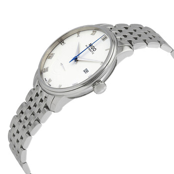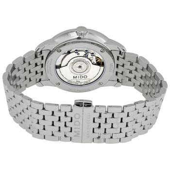 Stainless steel case with a stainless steel bracelet. Fixed stainless steel bezel. White dial with silver-tone dauphine-style hands and Roman numeral hour markers. Dial Type: Analog. Date display at the 3 o'clock position. Power reserve indicator. ETA caliber 2897 automatic movement, based upon ETA 2892, containing 21 Jewels, bitting at 28800 vph, and has a power reserve of approximately 42 hours. Scratch resistant sapphire crystal. Pull / push crown. Transparent case back. Round case shape. Case size: 40 mm. Case thickness: 9.23 mm. Band width: 20 mm. Fold over clasp with a push button release. Water resistant at 30 meters / 100 feet. Functions: date, hour, minute, second. Baroncelli Power Reserve Series. Casual watch style. Watch label: Swiss Made. Mido Baroncelli Power Reserve Automatic White Dial Men's Watch M027.428.11.013.00.