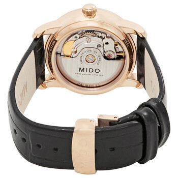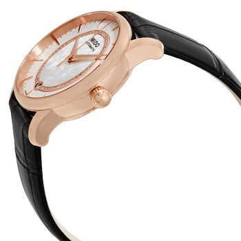 Rose gold PVD stainless steel case with a black leather strap. Fixed rose gold PVD bezel. Mother of pearl (diamond-set) dial with rose gold-tone dauphine-style hands and index hour markers. Minute markers around the outer rim. Dial Type: Analog. Date display at the 6 o'clock position. ETA caliber C07.611 automatic movement, containing 25 Jewels, bitting at 21600 vph, and has a power reserve of approximately 80 hours. Scratch resistant sapphire crystal. Pull / push crown. Transparent case back. Round case shape. Case size: 33 mm. Case thickness: 9.4 mm. Band width: 18 mm. Fold over clasp. Water resistant at 50 meters / 165 feet. Functions: date, hour, minute, second. Baroncelli Prisma Series. Casual watch style. Watch label: Swiss Made. Mido Baroncelli Prisma Automatic Ladies Watch M007.207.36.116.00.