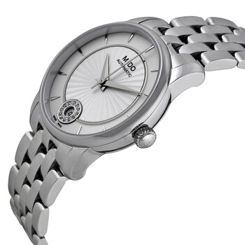 Stainless steel case with a stainless steel bracelet. Fixed stainless steel bezel. Silver dial with silver-tone hands and index hour markers. Dial Type: Analog. Diamond-set date display at the 6 o'clock position. Swiss automatic movement with a 40-hour power reserve. Scratch resistant sapphire crystal. Screw down crown. Skeleton case back. Case diameter: 33 mm. Case thickness: 9.4 mm. Round case shape. Band width: 18 mm. Deployment clasp. Water resistant at 100 meters / 330 feet. Functions: date, hour, minute, second. Casual watch style. Mido Baroncelli Silver Dial Stainless Steel Ladies Watch M0072071103600.
