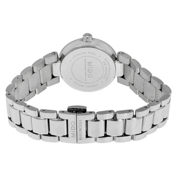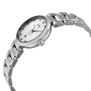 Stainless steel case with a stainless steel bracelet. Fixed stainless steel bezel. Silver dial with silver-tone dauphine-style hands and diamond hour markers. A Roman numeral appears at the 12 o'clock position. Dial Type: Analog. Date display at the 6 o'clock position. ETA caliber 956.112 quartz movement. Scratch resistant sapphire crystal. Pull / push crown. Solid case back. Round case shape. Case size: 29 mm. Case thickness: 7.98 mm. Band width: 8.50 mm. Fold over clasp with a push button release. Water resistant at 50 meters / 165 feet. Functions: date, hour, minute, second. Baroncelli Series. Dress watch style. Watch label: Swiss Made. Mido Baroncelli Silver Diamond Dial Ladies Watch M022.210.11.036.00.