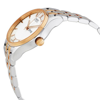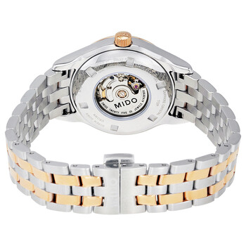 Stainless steel case with a two-tone (silver-tone and rose gold PVD) stainless steel bracelet. Fixed rose gold PVD bezel. Silver dial with rose gold-tone dauphine-style hands and index hour markers. Minute markers around the outer rim. Dial Type: Analog. Day of the week and date display at the 3 o'clock position. ETA caliber 2678 automatic movement, based upon ETA 2671, containing 25 Jewels, bitting at 28800 vph, and has a power reserve of approximately 38 hours. Scratch resistant sapphire crystal. Pull / push crown. Transparent case back. Round case shape, case size: 33 mm. Case thickness: 10.45 mm. Band width: 16 mm. Fold over clasp with a double push button release. Water resistant at 100 meters / 330 feet. Functions: date, day, hour, minute, second. Belluna Series. Casual watch style. Watch label: Swiss Made. Mido Belluna Automatic Silver Dial Ladies Watch M0012302203191.