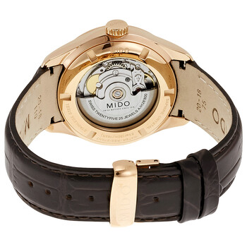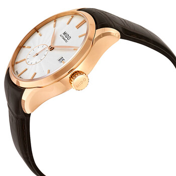 Rose gold PVD stainless steel case with a black leather strap. Fixed rose gold PVD bezel. Silver dial with rose gold-tone leaf-style hands and index hour markers. Dial Type: Analog. Date display at the 3 o'clock position. Seconds sub-dial at the 7 o'clock position. ETA caliber 2825-2 automatic movement, based upon ETA 2824-2, containing 25 Jewels, bitting at 28800 vph, and has a power reserve of approximately 42 hours. Scratch resistant sapphire crystal. Screw down crown. Transparent case back. Round case shape. Case size: 40 mm. Case thickness: 11.1 mm. Band width: 20 mm. Water resistant at 50 meters / 165 feet. Functions: date, hour, minute, second. Casual watch style. Watch label: Swiss Made. Mido Belluna Automatic Silver Dial Watch M024.428.36.031.00.