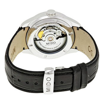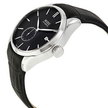 Stainless steel case with a black leather strap. Fixed stainless steel bezel. Black dial with silver-tone leaf-style hands and index hour markers. Dial Type: Analog. Date display at the 3 o'clock position. Small seconds sub-dial. ETA caliber 2825-2 automatic movement, based upon ETA 2824-2, containing 25 Jewels, bitting at 28800 vph, and has a power reserve of approximately 42 hours. Scratch resistant sapphire crystal. Push / pull crown. Transparent case back. Round case shape. Case size: 40 mm. Case thickness: 12.6 mm. Band width: 20 mm. Fold over clasp. Water resistant at 50 meters / 165 feet. Functions: date, hour, minute, second. Casual watch style. Watch label: Swiss Made. Mido Belluna II Automatic Black Dial Men's Watch M024.428.16.051.00.