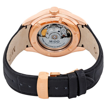 Rose gold PVD stainless steel case with a black leather strap. Fixed rose gold PVD stainless steel bezel. Black dial with rose gold-tone leaf-style shape hands and index hour markers. Dial Type: Analog. Date display at the 3 o'clock position. Seconds subdials. ETA Caliber 2825-2 Automatic movement, based upon ETA 2824-2, containing 25 Jewels, bitting at 28800 vph, and has a power reserve of approximately 42 hours. Scratch resistant sapphire crystal. Transparent case back. Round case shape, case size: 40 mm, case thickness: 12.6 mm. Band width: 20 mm. Fold over clasp. Water resistant at 50 meters / 165 feet. Functions: date, hour, minute, second. Casual watch style. Watch label: Swiss Made. Mido Belluna II Automatic Black Dial Men's Watch M024.428.36.051.00.