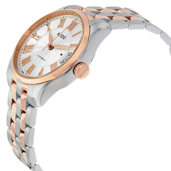 Stainless steel case with a two-tone (silver and rose gold PVD) stainless steel bracelet. Fixed rose gold PVD bezel. Silver dial with rose gold-tone hands and Roman numeral hour markers. Minute markers around the outer rim. Dial Type: Analog. Date display at the 3 o'clock position. Mido calibre 80.61 automatic movement with an 80hour power reserve. Scratch resistant sapphire crystal. Screw down crown. Transparent case back. Case size: 33 mm. Case thickness: 9.95 mm. Round case shape. Band width: 18 mm. Fold over clasp. Water resistant at 50 meters / 165 feet. Functions: date, hour, minute, second. Luxury watch style. Watch label: Swiss Made. Mido Belluna II Automatic Ladies Watch M024.207.22.033.00.