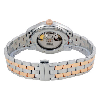 Stainless steel case with a two-tone (silver and rose gold PVD) stainless steel bracelet. Fixed rose gold PVD bezel. Silver dial with rose gold-tone hands and index hour markers. Dial Type: Analog. Date display at the 3 o'clock position. Mido calibre 80.611 automatic movement with an 80-hour power reserve. Scratch resistant sapphire crystal. Transparent case back. Case size: 40 mm. Case thickness: 11.01 mm. Round case shape. Band width: 20 mm. Deployment clasp. Water resistant at 50 meters / 165 feet. Functions: date, hour, minute, second. Dress watch style. Watch label: Swiss Made. Mido Belluna II Automatic Silver Dial Men's Watch M024.407.22.031.00.