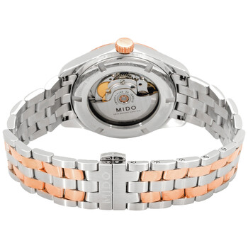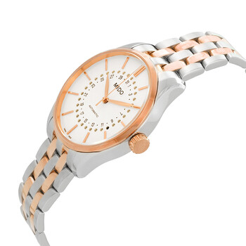 Silver-tone stainless steel case with a two-tone (silver-tone and rose gold PVD) stainless steel bracelet. Fixed rose gold PVD stainless steel bezel. Silver dial with rose gold-tone hands and index hour markers. Dial Type: Analog. Mido Calibre Powermatic 80 COSC (base ETA C07.621 Automatic movement, based upon ETA C07.621, containing 25 Jewels, bitting at 21600 vph, and has a power reserve of approximately 80 hours. Scratch resistant sapphire crystal. Transparent case back. Round case shape, case size: 40 mm, case thickness: 11 mm. Band width: 20 mm. Deployment with push button release clasp. Water resistant at 50 meters / 165 feet. Functions: date, hour, minute, second. Belluna II Series. Dress watch style. Watch label: Swiss Made. Mido Belluna II Automatic Silver Dial Men's Watch M0244072203109.
