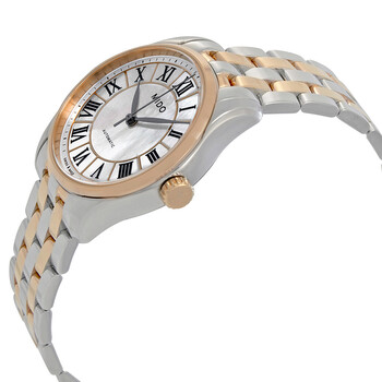 Stainless steel case with a two-tone (silver and rose gold PVD) stainless steel bracelet. Fixed rose gold PVD stainless steel bezel. Mother of pearl dial with black hands and Roman numeral hour markers. Minute markers around the outer rim. Dial Type: Analog. Automatic movement with an 80-hour power reserve. Scratch resistant sapphire crystal. Transparent case back. Round case shape. Case size: 33 mm. Case thickness: 9.95 mm. Band width: 18 mm. Deployment clasp. Water resistant at 50 meters / 165 feet. Functions: hour, minute, second. Dress watch style. Watch label: Swiss Made. Mido Belluna II Mother of Pearl Dial Ladies Watch M024.207.22.110.00.