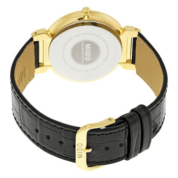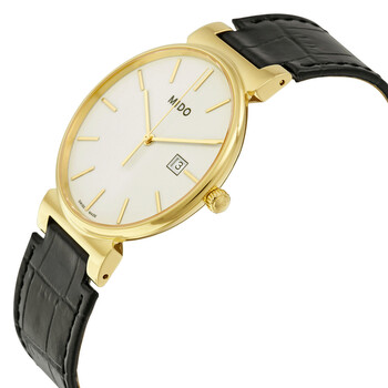 Gold PVD stainless steel case with a black leather strap. Fixed gold PVD bezel. White dial with gold-tone hands and index hour markers. Dial Type: Analog. Date display at the 3 o'clock position. Caliber 955.412 quartz movement. Scratch resistant sapphire crystal. Pull / push crown. Solid case back. Case size: 38 mm. Case thickness: 5.8 mm. Round case shape. Band width: 16 mm. Tang clasp. Water resistant at 30 meters / 100 feet. Functions: date, hour, minute, second. Additional Info: extra long strap. Dress watch style. Watch label: Swiss Made. Mido Caballero White Dial Men's Watch M0096103601100