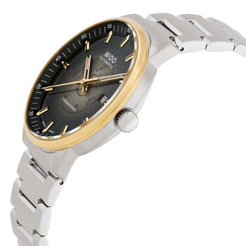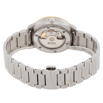 Silver-tone stainless steel case and bracelet. Fixed yellow gold PVD stainless steel bezel. Black dial with gold-tone hands and index hour markers. Minute markers around the outer rim. Dial Type: Analog. Luminescent hands and markers. Date display at the 3 o'clock position. Mido Calibre 80 automatic movement with an 80-hour power reserve. Scratch resistant sapphire crystal. Pull / push crown. Transparent case back. Round case shape, case size: 40 mm, case thickness: 10.8 mm. Band width: 21 mm. Fold over clasp with a safety release. Water resistant at 50 meters / 165 feet. Functions: date, hour, minute, second. Commander Series. Casual watch style. Watch label: Swiss Made. Mido Commander Automatic Black Dial Men's Watch M0214072141100.