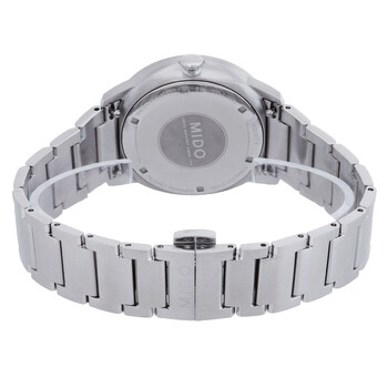 Silver-tone stainless steel case and bracelet. Fixed silver-tone stainless steel bezel. Blue dial with silver-tone hands and index hour markers. Minute markers around the outer rim. Dial Type: Analog. Date display at the 3 o'clock position. Automatic movement with a 72-hour power reserve. Scratch resistant sapphire crystal. Pull / push crown. Solid case back. Round case shape, case size: 35 mm, case thickness: 9.2 mm. Band width: 19 mm. Folding clasp. Water resistant at 50 meters / 165 feet. Functions: date, hour, minute, second. Commander Series. Casual watch style. Watch label: Swiss Made. Mido Commander Automatic Blue Dial Ladies Watch M0212071104100.