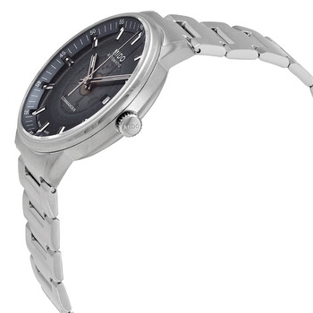 Silver-tone stainless steel case and bracelet. Fixed silver-tone stainless steel bezel. Blue dial with silver-tone hands and index hour markers. Minute markers around the outer rim. Dial Type: Analog. Luminescent hands and markers. Date display at the 3 o'clock position. Mido Calibre Powermatic 80 (ETA C07.611) Automatic movement, based upon ETA 2824-2, containing 23 Jewels, bitting at 21600 vph, and has a power reserve of approximately 80 hours. Scratch resistant sapphire crystal. Screw down crown. Transparent see through case back. Round case shape, case size: 40 mm, case thickness: 10.8 mm. Band width: 21 mm. Fold over clasp. Water resistant at 50 meters / 165 feet. Functions: date, hour, minute, second. Commander Series. Dress watch style. Watch label: Swiss Made. Mido Commander Automatic Blue Dial Men's Watch M0214071141101.