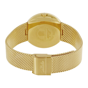 Gold PVD stainless steel case with a gold-tone PVD stainless steel mesh bracelet. Fixed gold PVD stainless steel bezel. Silver dial with luminous gold-tone hands and index hour markers. Dial Type: Analog. Luminescent hands. Day of the week and date display at the 3 o'clock position. ETA caliber 2836-2 aof approximately 40 hours. Scratch resistant hesalit crystal crystal. Aquadura cork crown. Solid case back. Round case shape. Case size: 37 mm. Band width: 20 mm. Fold over slip through clasp. Water resistant at 50 meters / 165 feet. Functions: date, day, hour, minute, second. Commander I Series. Dress watch style. Watch label: Swiss Made. Mido Commander I Automatic Silver Dial Gold-tone Men's Watch M842932113.
